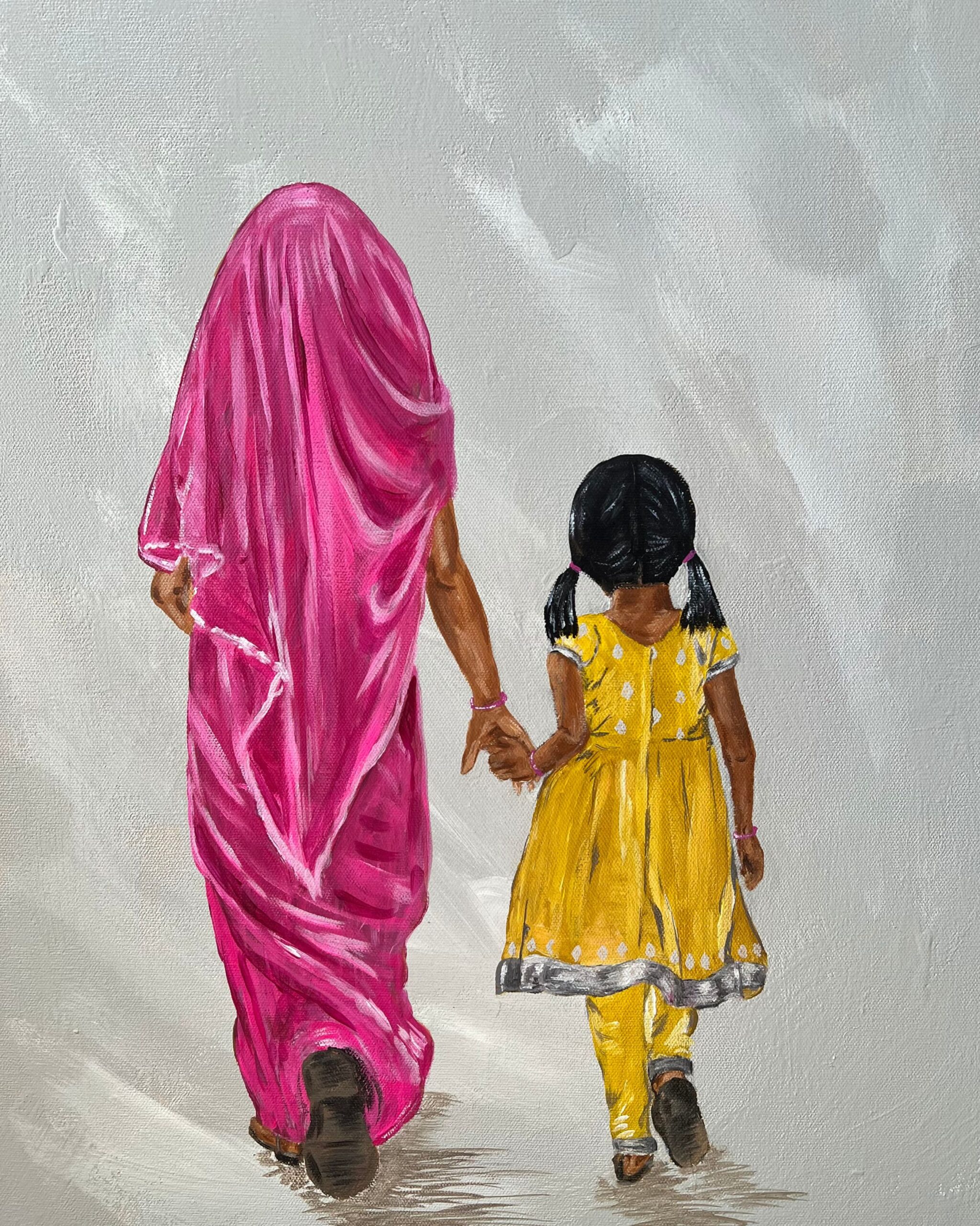 This painting symbolizes the deep bonds of motherhood and generational guidance. The mother and daughter walking together represents strong family values while exploring the balance between honoring tradition and forging one’s own path. The work speaks to the evolving journey of identity where a child walks in her Indian born mother’s footsteps yet begins to shape her own direction in a world of blended cultures.