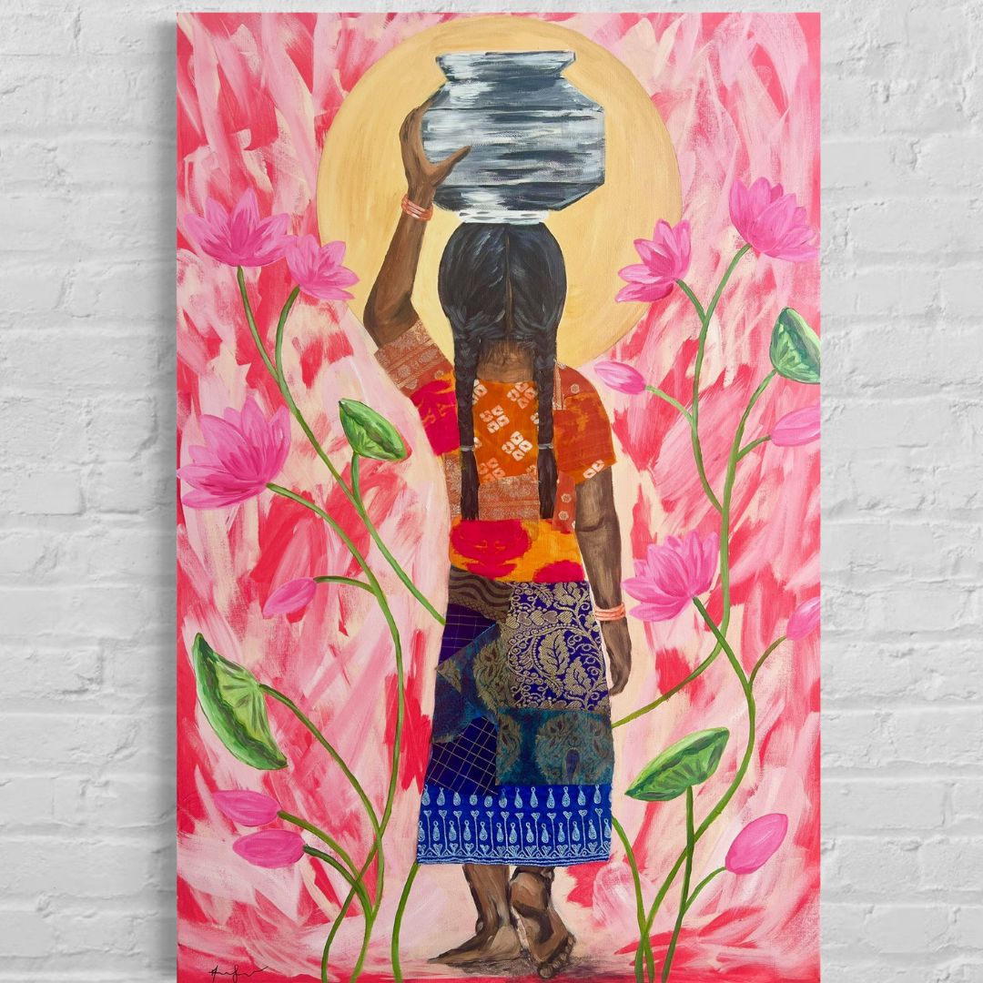 This piece explores the weight of responsibility placed on young girls, especially in traditional settings, while also confronting the layered impact of colorism. The mixed textiles. consisting of upcycled saree fabrics, symbolize her effort to balance cultural expectations and modern identity, challenging both beauty standards and fast fashion’s erasure of heritage. ‘Not So Fast Fashion’ is a quiet but powerful reflection on resilience, identity, and the burdens young women often carry that are both seen and unseen.